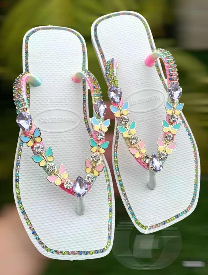 Com pedrarias banhado em borboleta na coloração azul e com fio de strass banho